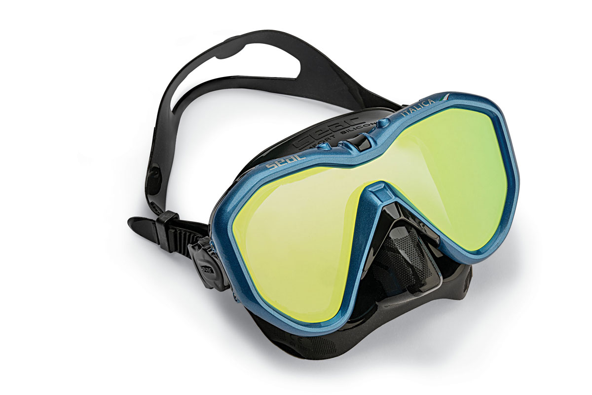 The Italica blends sleek Italian styling with smart performance features. The skirt is made from high- quality silicone, with textured sections placed strategically on the face for a more positive grip when clearing or adjusting the mask. The rigid frame is mated to four-way swiveling buckles with chrome- plated metal screws for durability and comfort.