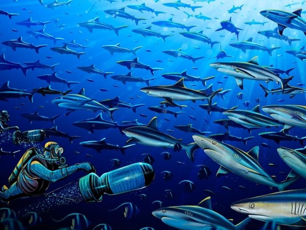 Francesca’s artwork, inspired by her 200 Sharks Project, portrays sharks as magnificent, vital species, transforming fear into fascination through vivid illustration and storytelling, highlighting their beauty, resilience, and the urgent need for marine conservation.